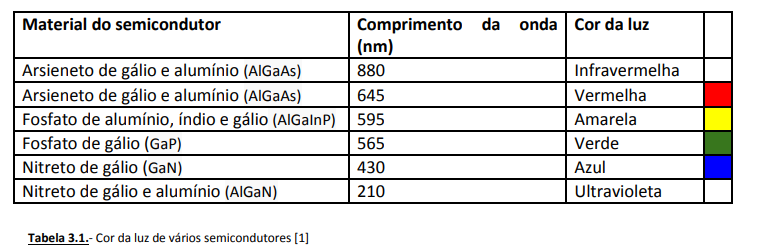 A luz emitida é praticamente monocromática, ou seja, cada LED tem uma só cor, esta é definida pela composição química do semicondutor e pode abranger uma larga gama, desde o infravermelho até ao ultravioleta. Na Tabela 3.1. mostra alguns dos materiais que constituem os semicondutores e a respectiva luz emitida [3].