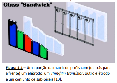 Por fim, os monitores LCD são compostos por uma grelha de píxeis expostos à frente de uma fonte luminosa ou de um painel refletor de luz. Cada pixel é constituído por 3 sub-píxeis, um vermelho, um verde e um azul, ou seja, um sub-pixel por cada cor primária. Esta grelha de píxeis encontra-se à frente de elétrodos que, ao controlar a tensão elétrica, controlam a intensidade da luz que deve passar em cada sub-pixel do monitor. Os píxeis são uma matriz de parcelas coloridas que ajudam a emitir todas as cores do espetro de luz [7, 10]. Para formar uma cor específica, controla-se a tensão do elétrodo de forma a que seja emitida luz com uma determinada percentagem de intensidade para cada subpixel. Deve-se notar que, na realidade, os sub-píxeis são tão pequenos que não são discerníveis pelo olho humano [10].