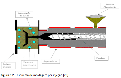 Este processo utiliza o calor de forma a moldar o plástico, daí só ser possível nos plásticos termoplásticos. Consiste na passagem de plástico em forma de granulados para um cilindro de injeção, esse cilindro é aquecido e dentro dele encontra-se um parafuso em rotação, esse parafuso vai provocar o contacto dos granulados com a superfície aquecida do cilindro, e vai-os empurrando em direção ao molde. Todo o calor gerado, não só pelo cilindro mas também pela compressão e pelo atrito vão provocar o amolecimento do plástico. Quando na extremidade do cilindro se acumula uma quantidade suficiente, o parafuso pára e num movimento rápido empurra o plástico para o interior do molde, este é arrefecido com água para o rápido endurecimento do plástico, sendo depois a peça ejetada, iniciando-se de seguida um novo ciclo [20,24]. Outro método utilizado, a extrusão, é bastante semelhante à moldagem por injeção, mas difere no facto de o plástico ser continuamente injetado numa matriz, sendo por isso muito utilizado para o fabrico de tubos, paletes, etc. [20].