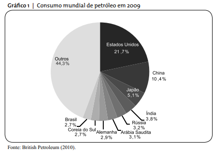 Os Estados Unidos (EUA) são os maiores consumidores de petróleo e derivados no mundo. Seu consumo supera 20 milhões de barris por dia, o que equivale a 21,7% do consumo mundial de petróleo (Gráfico 1).