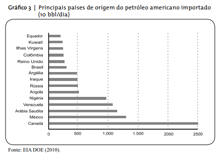 De fato, cerca de 33% do petróleo consumido nos EUA é produzido internamente, enquanto a maior parte é importada de nações politicamente instáveis (Gráficos 2 e 3). Em 2007, os EUA consumiram mais de 75 bilhões de barris de petróleo, ao custo de US$ 550 bilhões. O petróleo importado respondeu por 60% do total consumido, ao custo de US$ 300 bilhões, o que equivale a 40% do valor do défi cit na balança comercial americana naquele ano [Energy Security Leadership Council (2008)].