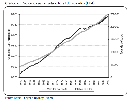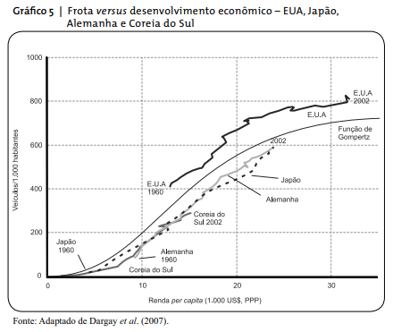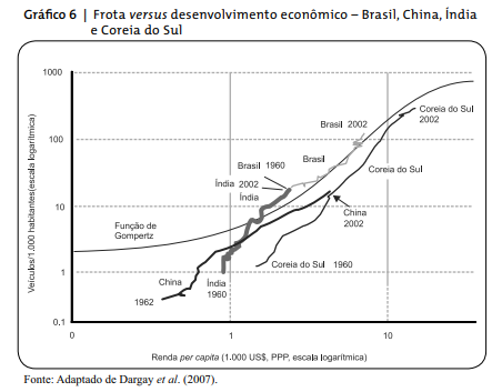 É possível afirmar que o crescimento, ao longo do tempo, da frota de automóveis em um país está diretamente relacionado ao seu nível de desenvolvimento econômico. Dargay et al. (2007) mostram que o padrão de crescimento ocorrido entre 1960 e 2002 em países como EUA, Alemanha e Japão, também pode ser observado em China, Índia, Brasil e Coreia do Sul. A relação entre o tamanho da frota nacional e o nível de desenvolvimento, medido pelo PIB dos países, apresenta uma curva em S, indicando que:
