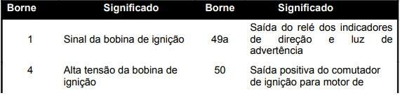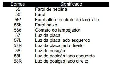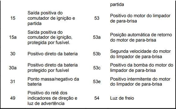 Em alguns componentes os terminais são identificados através de números / letras, como por exemplo: 30, 56, 56a, 56b... Tais números aparecem no esquema elétrico para indicar que a ligação no cabo elétrico pertence a um determinado circuito ou linha.