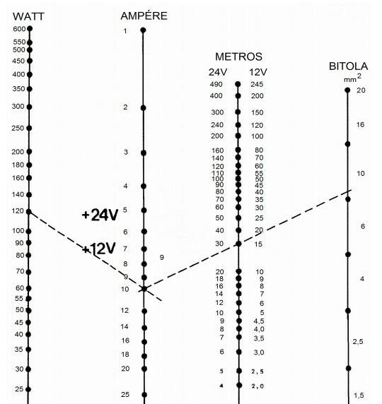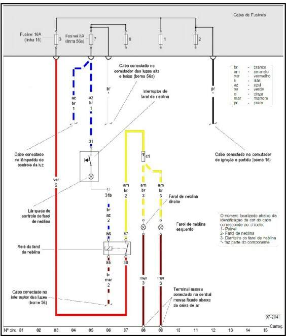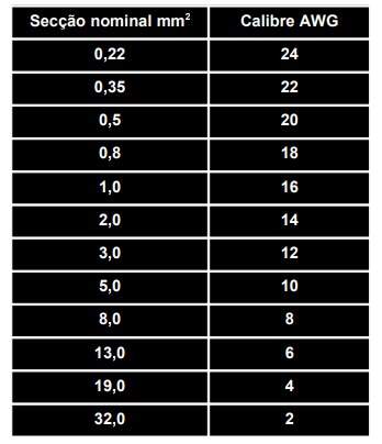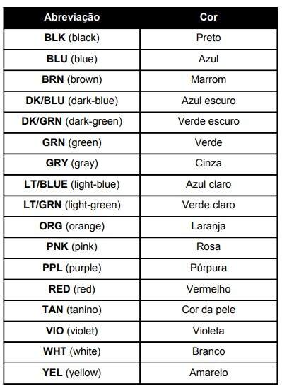 Assim, na ligação entre o motor de arranque e a bateria, por exemplo, utiliza-se um fio de diâmetro muito maior que as dos restantes fios, porque a corrente que o atravessa chega a atingir de 300 a 400 A. Nos esquemas elétricos, as cores dos fios são normalmente indicadas por meio de letras.