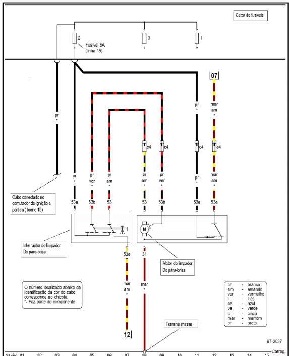 Cerca de 1000 metros de fio unem os componentes elétricos num automóvel atual. Todos os fios da instalação, à exceção das ligações à massa, à bateria e aos cabos de alta tensão da ignição, apresentam cores diversas, que correspondem a um código de identificação. Na maioria dos automóveis, o código está normalizado a fim de permitir reconhecer rapidamente os diferentes circuitos ao efetuar-se qualquer reparação.