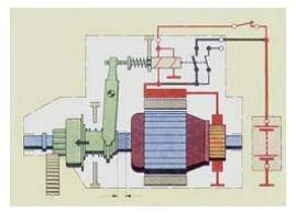 Estágio de ligação 1: Chave de partida é acionada. A bobina de atracamento, a bobina de retenção da chave magnética, a bobina de campo e o induzido recebem corrente elétrica.