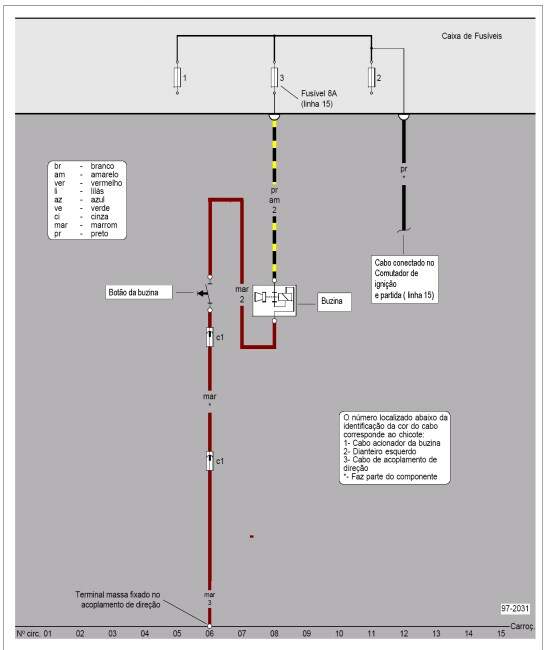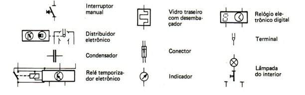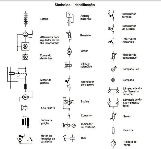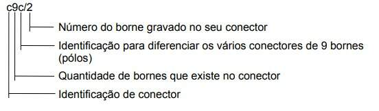 Quase todos os componentes elétricos são identificados ao lado do borne de ligação, com números / letras para facilitar na montagem. Nos esquemas elétricos eles aparecem no meio do cabo, próximo ao componente. Alguns conectores possuem gravados ao lado dos bornes (pólos), números / letras que indicam as posições de montagem dos cabos elétricos. No esquema elétrico, os números / letras que estão gravados no conector também aparecem indicados logo após o código do conector.