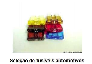 Vimos na última seção como o aumento de calor no fio depende da resistência e da quantidade de corrente que flui por ela. Os fusíveis são apenas um tipo especial de fio dentro de um conector independente. A maioria dos fusíveis de automóvel possui duas lâminas condutoras para conexão e uma capa plástica que contém o condutor (que se abrirá, caso a corrente exceda certo valor). Existem também alguns fusíveis na fiação do carro, chamados elos fusíveis.