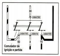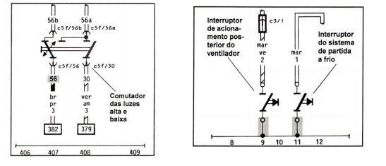 Os números inscritos em quadradinhos identificam as interrupções efetuadas para evitar cruzamento dos cabos elétricos e indicam o número do circuito em que o cabo continua. Localizado o número do circuito na parte inferior do diagrama, outro quadradinho na mesma direção indica o número do circuito onde houve a interrupção.