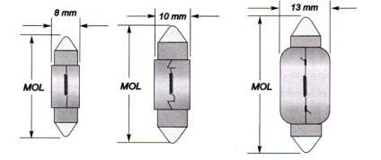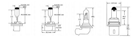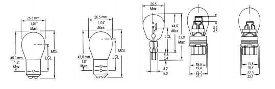 Para facilitar a conversão os fabricantes identificam as lâmpadas segundo características idênticas por um número específico homologado pelo American National Standards Institute (ANSI). Essas características incluem a forma do bulbo, as dimensões e as posições dos filamentos em relação à base. Como exemplo, uma lâmpada nº 1157 possui dois filamentos ( um de 32 candelas e o segundo de três candelas), uma base com dois pólos (D.C. Index) e o diâmetro do bulbo é de 1 polegada. O diâmetro e a forma do bulbo são expressos por um código formado por uma letra e um número. A letra significa a forma e o número corresponde á quantidade aproximada de 1/8 polegadas. Como por exemplo, o código S-8 designa um bulbo de forma esférica e um diâmetro de 8x1/8 po = 1 polegada.