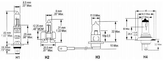 Dependendo do continente de origem do projeto do veículo, Europa ou América, a forma da base e a disposição dos terminais das lâmpadas halogenas são diferentes. A base das lâmpadas europeias tem base plástica com anel o´ring. As lâmpadas halogenas são usadas em faróis de serviço e faróis auxiliares ou luzes de neblina.