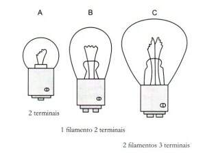 Como a fonte de calor vem da circulação da eletricidade, as lâmpadas devem ter pelo menos dois terminais conectados a cada uma das extremidades do filamento (Fig A). Normalmente, uma das extremidades do filamento ligado à parede da base, tem papel de terminal. Algumas lâmpadas têm dois filamentos de intensidade luminosa diferente. Elas têm três terminais, um comum conectado à base e um no início de cada filamento (Fig C). Outras lâmpadas, com um filamento, possuem dois terminais isolados situados na extremidade da base. Essa montagem permite controlar a lâmpada pela linha positiva ou pela linha negativa do circuito.