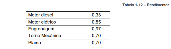 Cada tipo de sistema seja ele mecânico ou elétrico apresentam perdas que devem ser consideradas, no nosso caso precisamos identificar a Potência Induzida necessária para realizar a operação de torneamento. A Potência Efetiva que é responsável pelo arrancamento do cavaco do material a ser usinado está diretamente relacionado com o rendimento de cada máquina, na (Tabela 1-12), são apresentados alguns rendimentos.