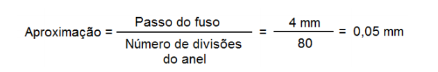 Na maioria das vezes os fusos possuem passo de 3 ou 4 mm, mais precisamos medir com o paquímetro para ter certeza, a quantidade de divisões do anel precisa ser contada, de posse dessa informação fica simples se calcular a aproximação, basta dividir o passo do fuso pela quantidade de divisões do anel graduado, veja a seguir os exemplos