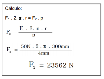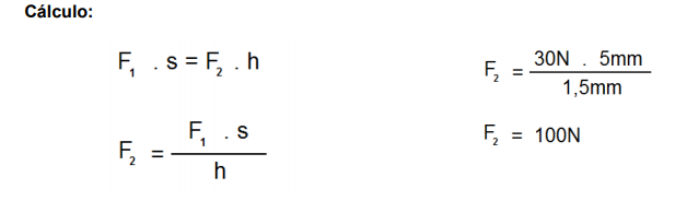 Logo abaixo será apresentado um exemplo de cálculo da força realizada pelo sistema de alavanca e rosca.