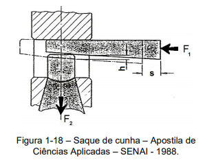 Para soltar um cone Morse do mangote do torno é necessária uma força F1 = 30N, a cunha percorre uma distância s = 5mm, a altura da cunha aumenta h = 1,5mm.