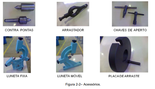 Os acessórios, (Figura 2-2) são itens capazes de aumentar o número de tarefas executadas no torno mecânico, tornando-o uma máquina muito versátil.