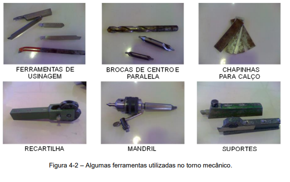 As ferramentas, (Figura 4-2) utilizadas no torno mecânico são responsáveis por entrar em contato com o material a ser usinado e moldá-lo de acordo com os movimentos dos carrinhos.