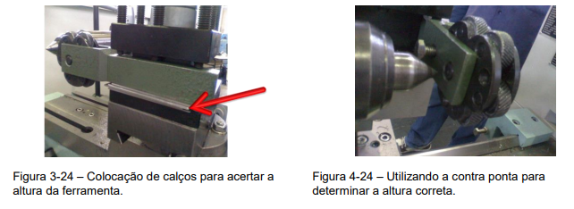 1º Passo – Regulando a altura da ferramenta de recartilhar com calços e ajuda da contra ponta, (Figuras 3-24 e 4-24).