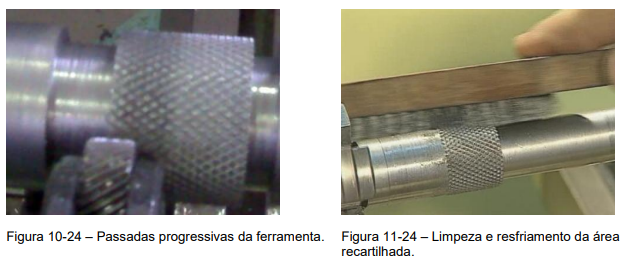 4º Passo – A ferramenta deverá ser deslocada automaticamente de um lado para outro da área a ser recartilhada (Figura 10-24), não podendo se esquecer de manter a limpeza e a refrigeração da área recartilhada (Figura 11-24). A cada passada da ferramenta aumenta-se a pressão da ferramenta em relação à peça até que as pirâmides da recartilha estejam formadas.