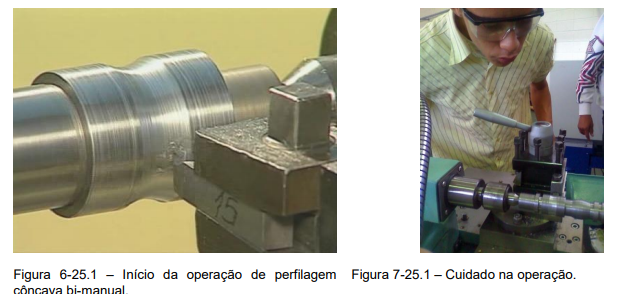 5º Passo – Com a movimentação dos dois carros transversal e superior utilizando as duas mãos a ferramenta deverá ser passada no perfil côncavo ou convexo para a retirada do excesso de material até que o perfil fique de acordo com o gabarito de raio, (Figura 5-25.1).