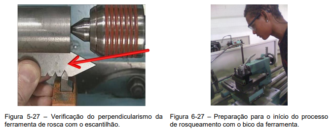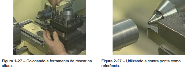 1º Passo – A ferramenta de rocar deverá ser colocada na altura (Figura 1-27) para evitar a quebra da mesma e também que o ângulo do filete da rosca não seja alterado.