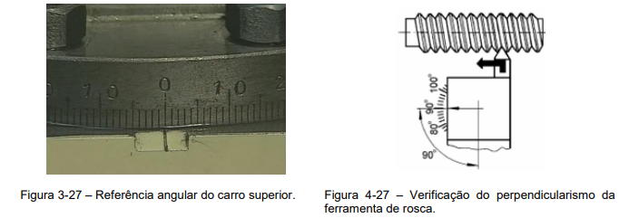 3º Passo – Verificando a perpendicularidade da ferramenta através da inclinação do carro superior na metade do ângulo da ferramenta, logo após o flanco da ferramenta deverá ser encostado na face da placa que servirá de referência, feito isso a ferramenta deverá ser fixada no castelo e o carrinho deverá ser retornado à zero, para que o filete seja executado de maneira correta, (Figura 3-27) e (Figura 4-27).