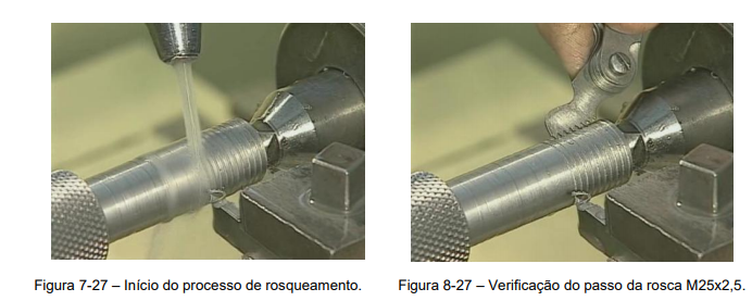 6º Passo – Início do processo de rosqueamento, colocar sempre óleo refrigerante ou de corte para facilitar a operação e melhorar o acabamento dos flancos do filete, (Figura 7-27).