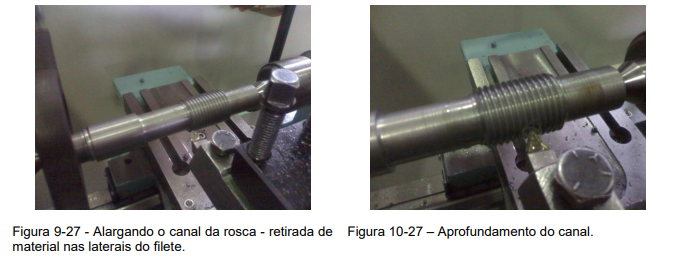27 Abrindo rosca no torno com a ponta da ferramenta.