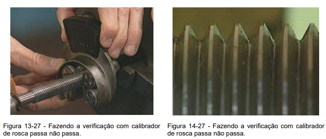 11º Passo – Quando o filete da rosca já estiver quase formado, isto é quando já estiver próximo da medida de profundidade calculada da rosca, deve-se sempre verificar com o calibrador de rosca ou calibrador passa-não-passa, se a mesma já está dentro do padrão, (Figura 13-27).
