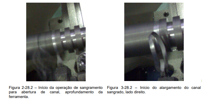 1º Passo – Início do sangramento para a abertura de canal, após a ferramenta ser colocada na altura, similarmente ao procedimento de corte. Inicia-se o canal posicionando a ferramenta no comprimento determinado pelo desenho técnico. Recomenda-se que a ferramenta seja menor que a medida da largura do canal para permitir o alargamento do mesmo, (Figura 2-28.2).