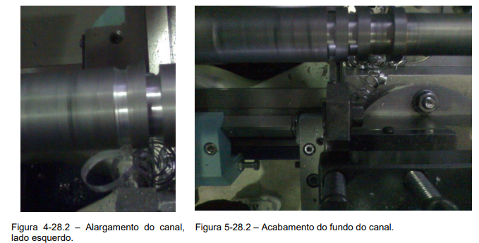 3º Passo – Alternando-se entre alargar e aprofundar dos lados do canal (Figura 4-28.2), o posicionamento da ferramenta deverá ser realizado com ajuda dos anéis graduados dos carros superior e transversal. Repete-se esse procedimento até deixar a medida do fundo do canal de acordo com o desenho.