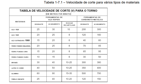 Velocidade de corte Vc [m/min], representa a quantidade de material em metros por minuto que deve passar pela aresta de corte da ferramenta. Essa informação é fornecida pelo fabricante e deverá ser respeitada na medida do possível com uma margem de 15%, tanto para cima quanto para baixo. No torno mecânico que trabalha com rotação constante será melhor adotar a rotação maior desde que não ultrapasse a margem (Tabela 1-7.1).