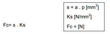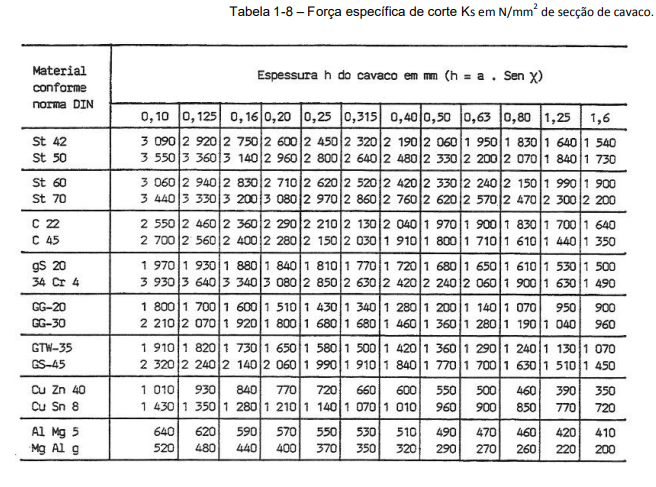 A força de corte necessária para usinar uma peça não só depende da secção do cavaco, mas também do material a ser usinado, ou seja, da resistência do material. Através de experiências, foi medida a força de corte por 1 mm2 de secção de vários materiais e se convencionou chamar de força específica de corte Ks em N/mm2 de secção. Esse valor Ks, varia também em função da espessura (h) do cavaco, que exerce grande influência na sua formação. A espessura (h) do cavaco deve ser calculada, e com esse valor consulta-se a (Tabela 1-8), e extrai-se os valores de ks, em função do material.