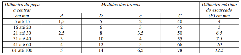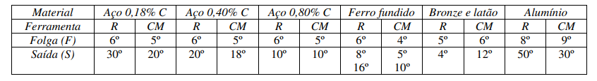A seguir temos uma tabela de valores dos ângulos de folga ou de incidência e de saída ou ataque para alguns materiais, com ferramentas de broquear de aço rápido, indicadas pela letra “R” e com ferramentas de past ilhas de carboneto metálico (WIDIA) “CM”.