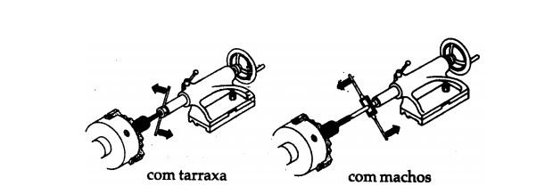 - Abrir roscas com tarraxa (externas) ou machos (internas), fixados no desandador ou no cabeçote móvel, diretamente ou por meio de mandril. É usado para peças de pequeno diâmetro (até 12mm).
