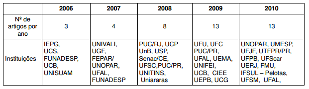 Houve um crescimento exponencial do número de publicações evidenciando participação de universidades públicas, inclusive, de institutos federais. As publicações de 2006 foram 100% oriundas de particulares, em 2007 houve a publicação de apenas um artigo de IES pública correspondendo a 25%. Em 2008 esse percentual foi mantido elevando-se para 69% em 2009 e 77% em 2010.