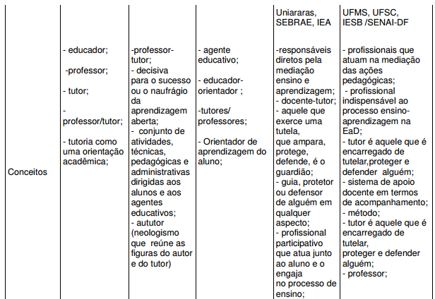 No que diz respeito à categoria “Conceitos” problematizamos: por que a definição “professor-tutor” está contemplada em trabalhos em todo período analisado? O termo “professor-tutor” foi utilizado com maior frequência nos trabalhos científicos dos três primeiros anos. Parece-nos que nesses trabalhos o enfoque está mais localizado na questão trabalhista e contratual do que na análise das implicações concretas que o tutor exerce no sistema didático configurado essencialmente entre conteúdos, professor e estudantes na modalidade presencial.