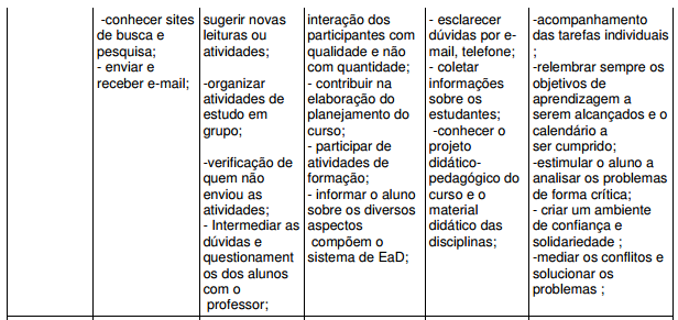 O tutor deverá estar atento ao nível de interatividade dos estudantes monitorando quais estão interagindo e conduzir a participação crítica reflexiva rompendo com a linearidade do processo de estudo individualizado. As orientações devem focar aspectos do conhecimento ajudando o estudante na conquista de autonomia e construção de competências investigativas enquanto ações que concretizam aprendizagem e desenvolvimento psíquico.