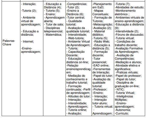 A análise das produções científicas sobre tutoria nos últimos 5 anos tomando como base os anais dos congressos internacionais da ABED permitiu mapear diferentes concepções sobre o perfil do tutor em virtude das práticas institucionais desenvolvidas em vários contextos. Ao sistematizar a análise a partir das categorias “Conceitos” e “Atribuições” foi possível fazer a triangulação com os resultados da categoria “Palavraschave”. Como isso, evidenciamos que embora elementos como as tecnologias educacionais estejam presentes em muitos textos, poucos autores propõe conceitualização e definição das atribuições dos tutores tendo a fluência tecnológica como princípio basilar.