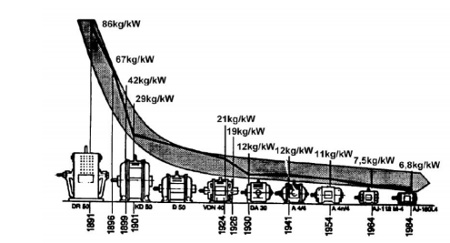 O desenvolvimento de condutores esmaltados, dos papéis ou filmes isolantes sintéticos, das chapas magnéticas, das ligas de alumínio e dos materiais plásticos, contribuíram ativamente para a redução da relação peso potência dos motores elétricos. Pode-se observar que o motor actual tem apenas 8 % do peso do seu antecessor em 1891. A redução do peso dos motores conduziu a que estes tivessem um menor tamanho (para uma mesma potência) de aproximadamente 20 % a cada década, com excepção das últimas décadas onde a redução foi menos acentuada. Esta evolução tecnológica é caracterizada principalmente, pelo desenvolvimento de novos materiais isolantes, que suportam temperaturas mais elevadas.