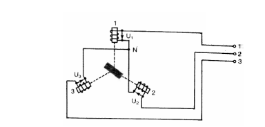 Campo girante provocado por um sistema trifásico de correntes em três instantes t1, t2 e t3.