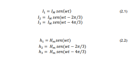 Expressões das correntes e dos campos magnéticos num sistema trifásico: