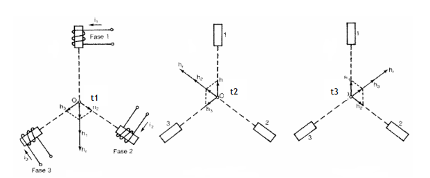 Será visto como é que a partir de um conjunto de três bobinas colocadas no estator deslocadas entre si de 120º, alimentadas por um sistema trifásico de correntes tal como se sugere na figura 2.6, é possível criar-se um campo girante. As três fases para o exemplo apresentado estão ligadas em estrela, no entanto poderiam estar ligadas em triângulo. Um sistema trifásico de correntes (i1,i2,i3) cria um sistema trifásico de campos magnéticos (h1,h2,h3).