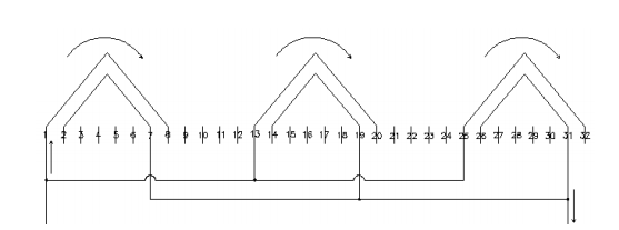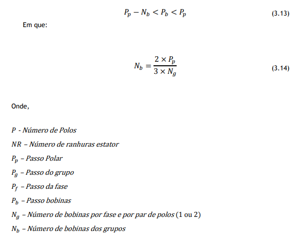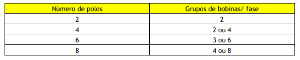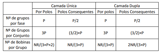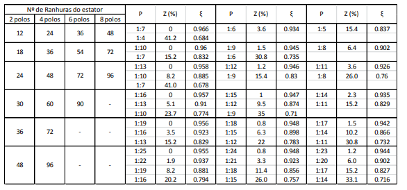 O valor de deve ser um número inteiro. Por sua vez o valor de N é dado na tabela a seguir em função do número de polos, do número de ranhuras e do passo médio do enrolamento.