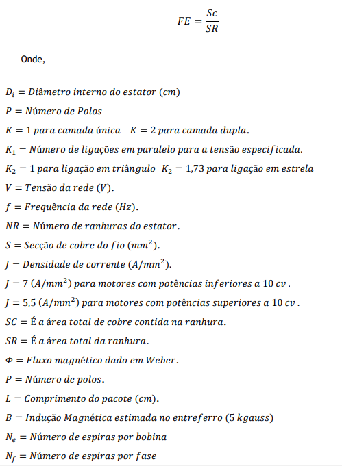 O dimensionamento que se apresenta é utilizado em motores de potência inferior a 50 Cv, de indução trifásicos totalmente fechados e com ventilação externa. A aplicação deste tipo de dimensionamento é sugerida para o caso de rebobinagem.