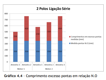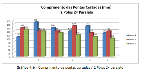 Foram tiradas 3 amostras de motores de 2 polos ligação 2 × paralelo, é possivel observar pelo gráfico o que foi dito anteriormente, não existe um controlo de corte de pontas, a ponta menor medida tem 100 mm e a maior tem 190 mm praticamente o dobro do tamanho.