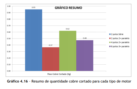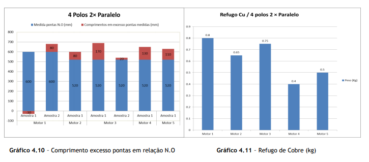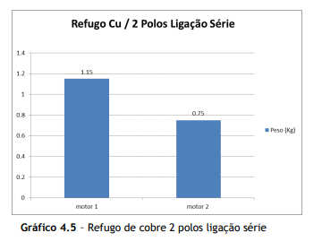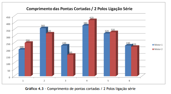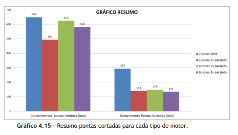 Estes motores com 2 polos ligação série apresentam as maiores pontas cortadas de todos os motores testados e apresentam também o maior peso de cobre refugado, este facto devese a que as pontas das bobinas são ligadas umas ao lado das outras o que faz com que haja muito refugo de cobre gerado. Isto demonstra que existe inadequação da N.O (nota de operação) para este tipo de motores. A maior ponta cortada foi de 420 mm o que representa um grande comprimento de cobre cortado como se pode observar pelo gráfico 4.3