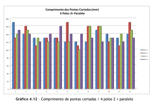 Este motor apresenta também excesso de comprimento de pontas cortadas, é possivel observar pelo gráfico 4.13 que a N.O apresentava dois valores de comprimento de pontas 300 mm e 650 mm. O motor é projetado com duas medidas de pontas por causa da distribuição das mesmas ao longo da periferia do estator bobinado tendo em conta o esquema de ligação.