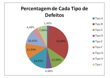 Foi realizado durante 45 dias um levantamento dos principais defeitos. Para o período de tempo considerado, foram registados um total de 67 defeitos dividindo-se os mesmos da forma representada no gráfico 4.1. (O percentual de cada defeito não foi revelado por ordem da WEG). Será detalhado mais à frente os defeitos encontrados.